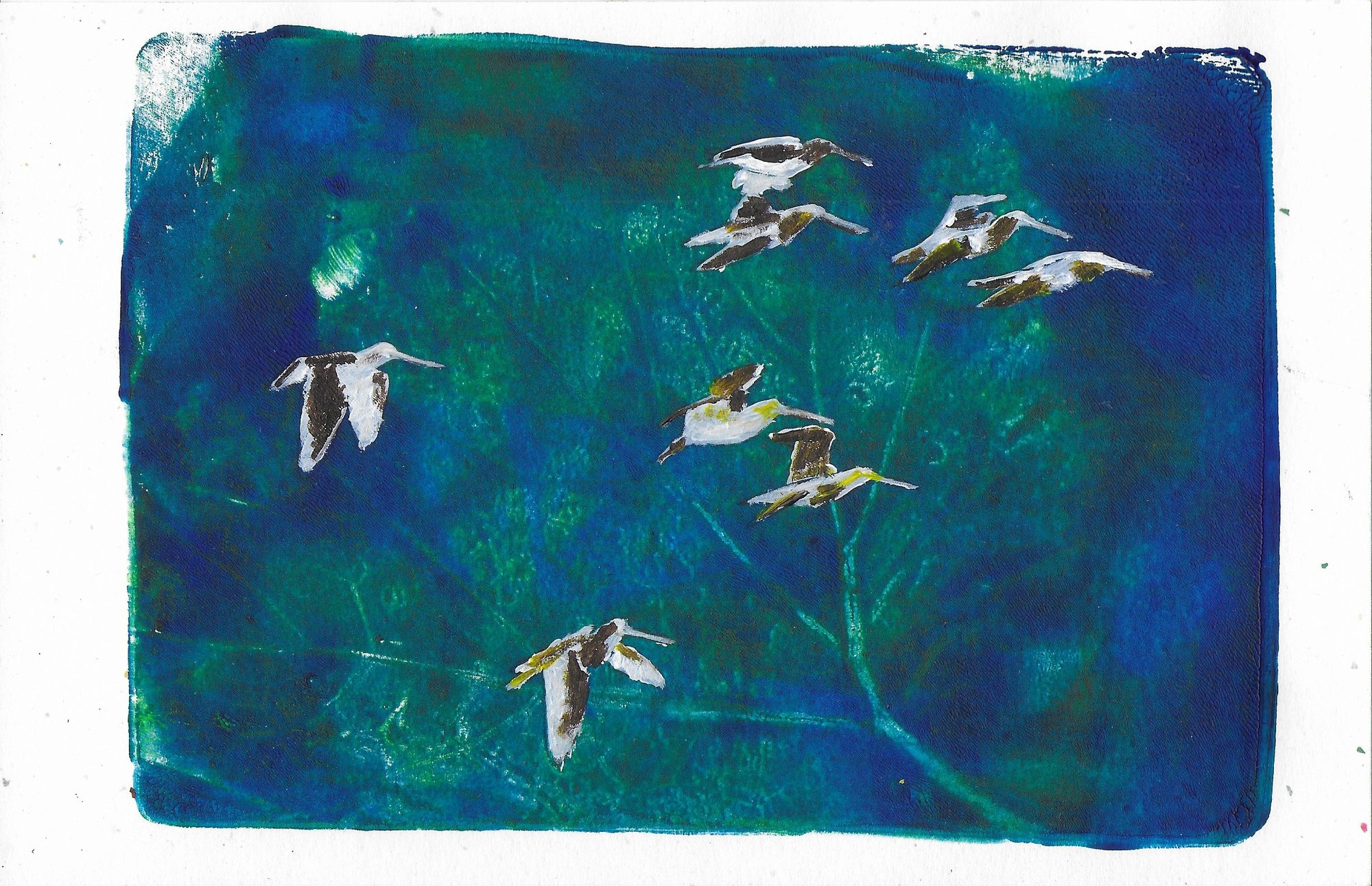 Reproduction inkjet print from original painting on botanical gelli print background. 5" x 7" unmatted